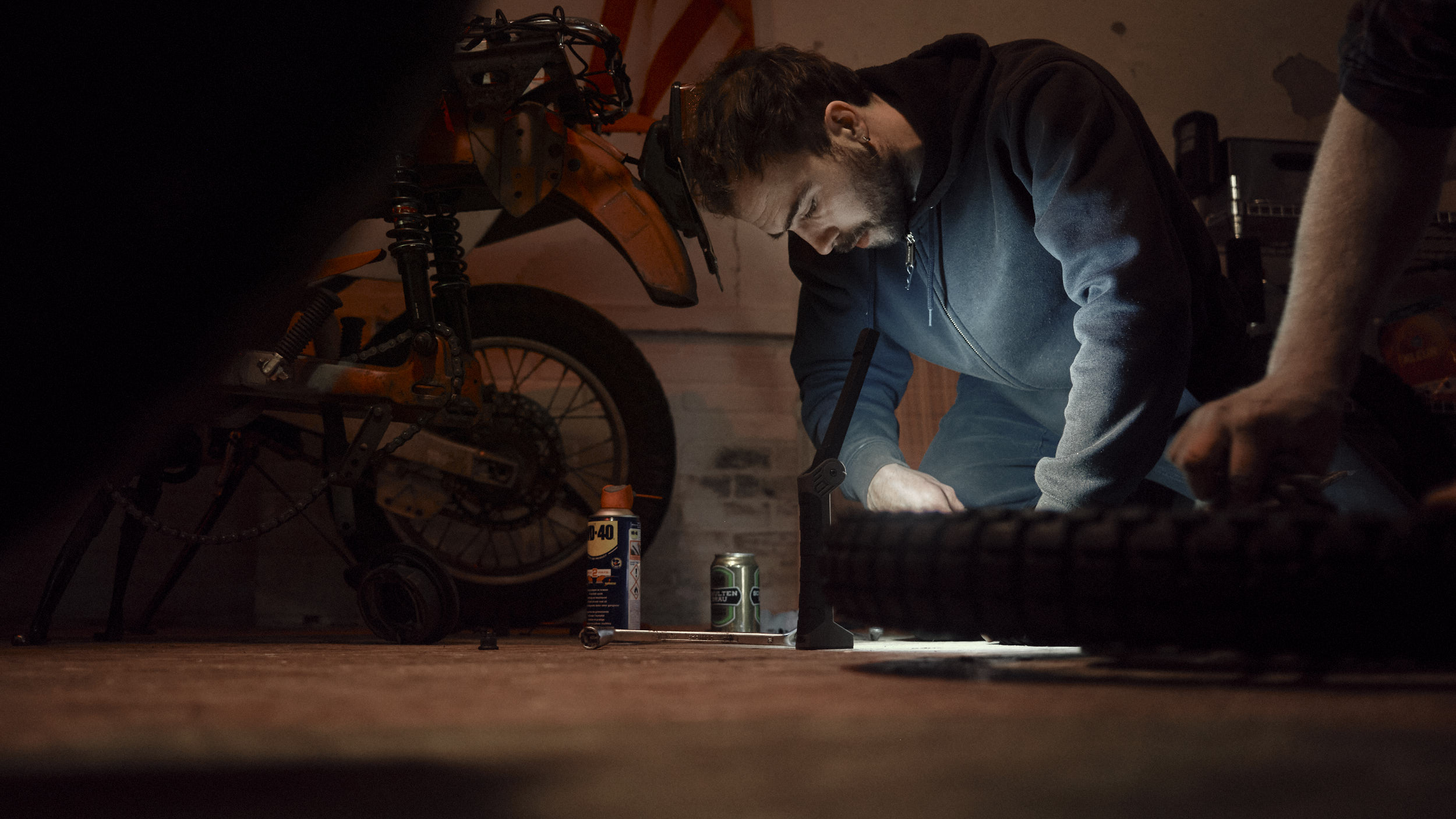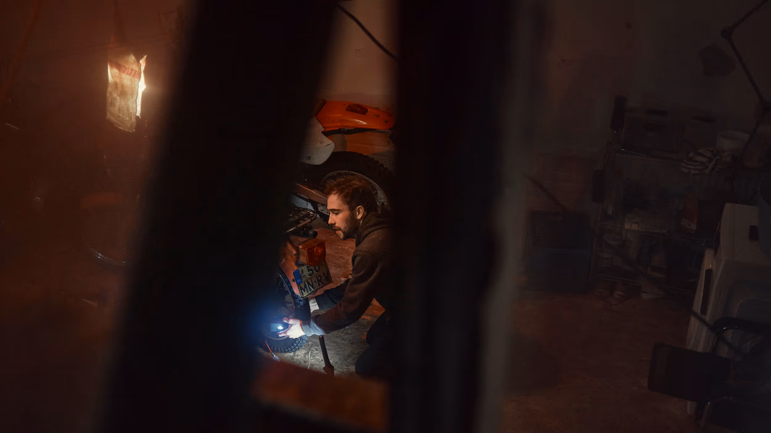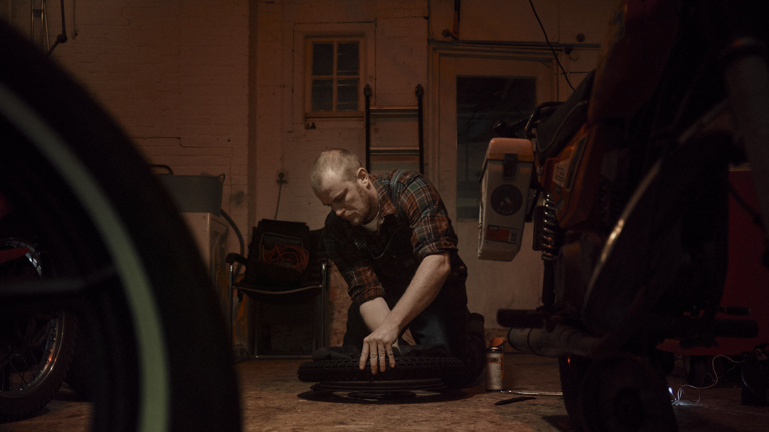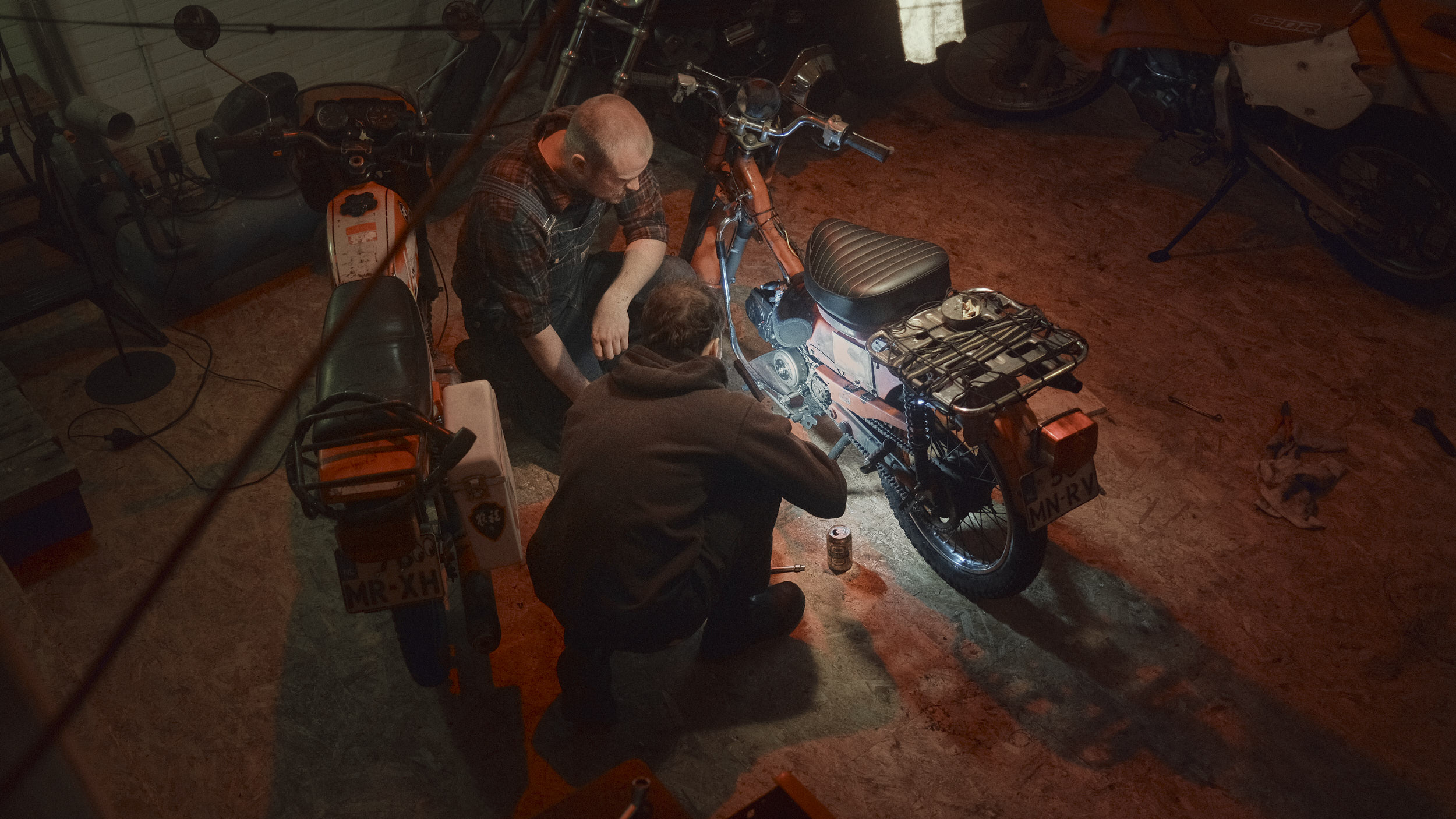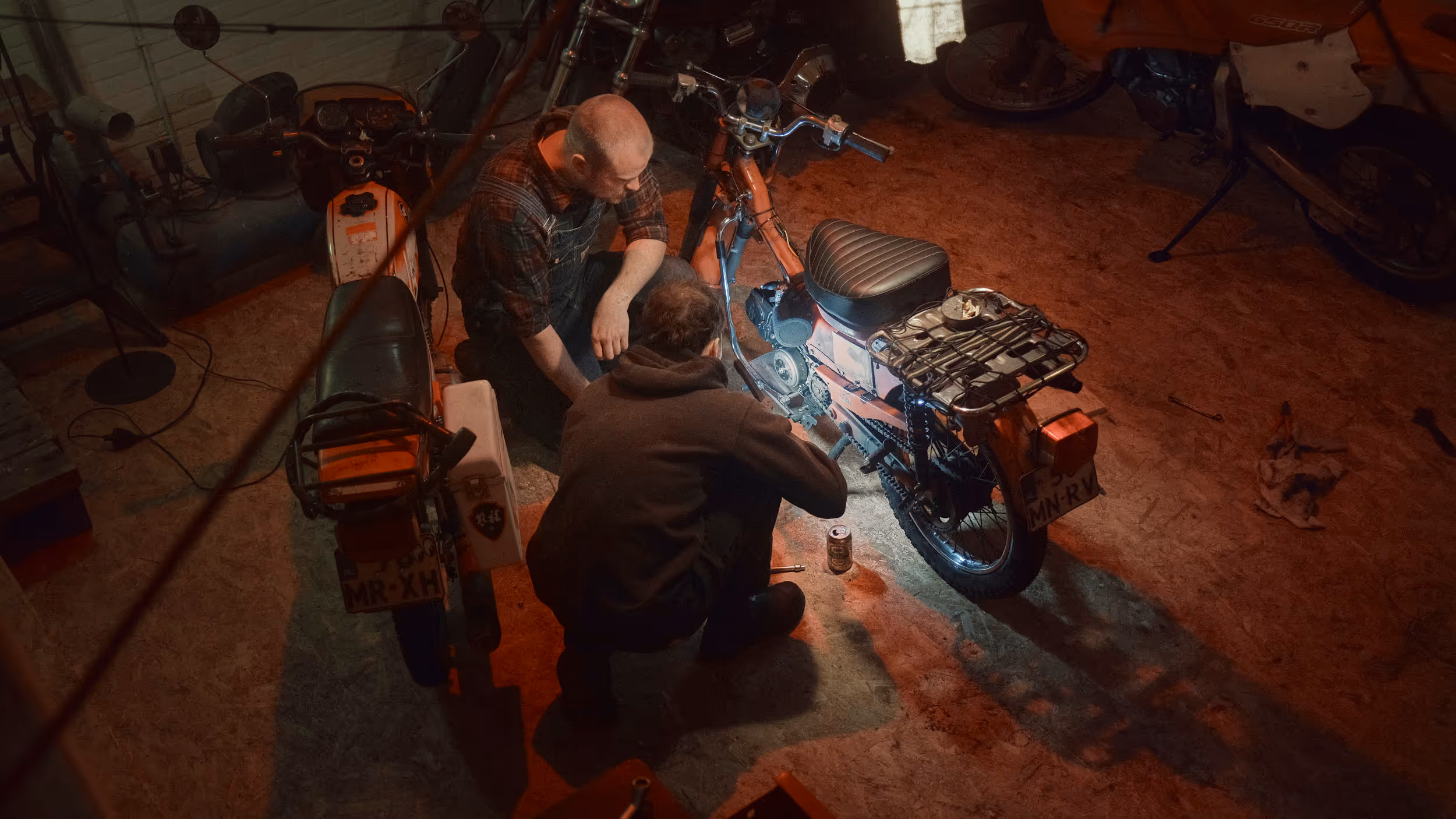 Two friends preparing their bikes for an upcoming Sahara trip.