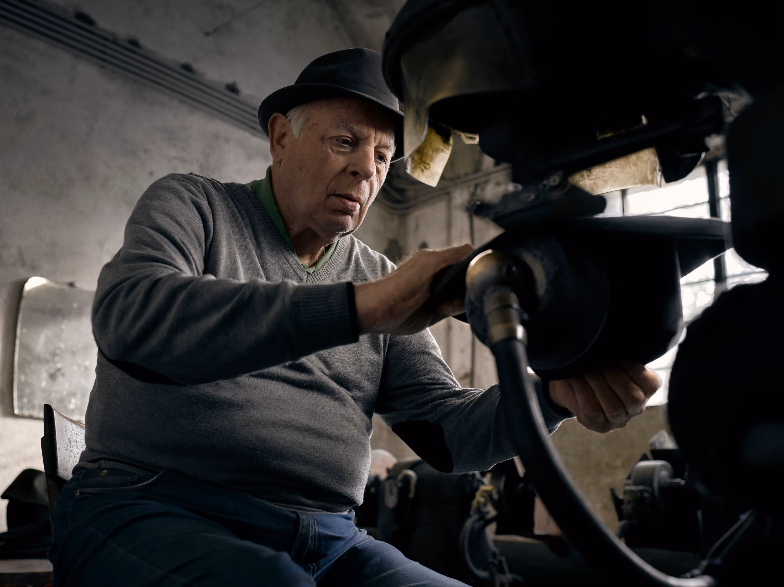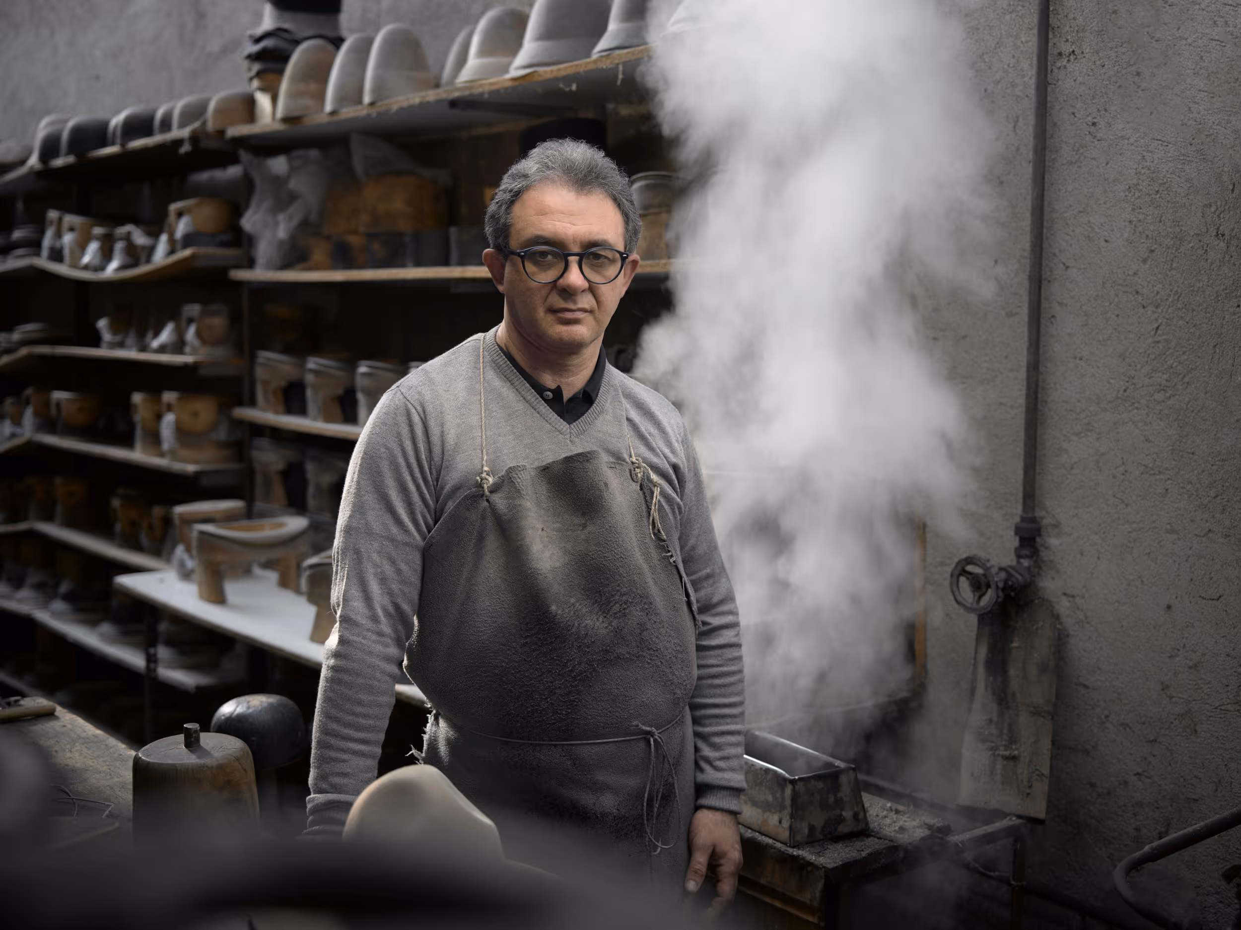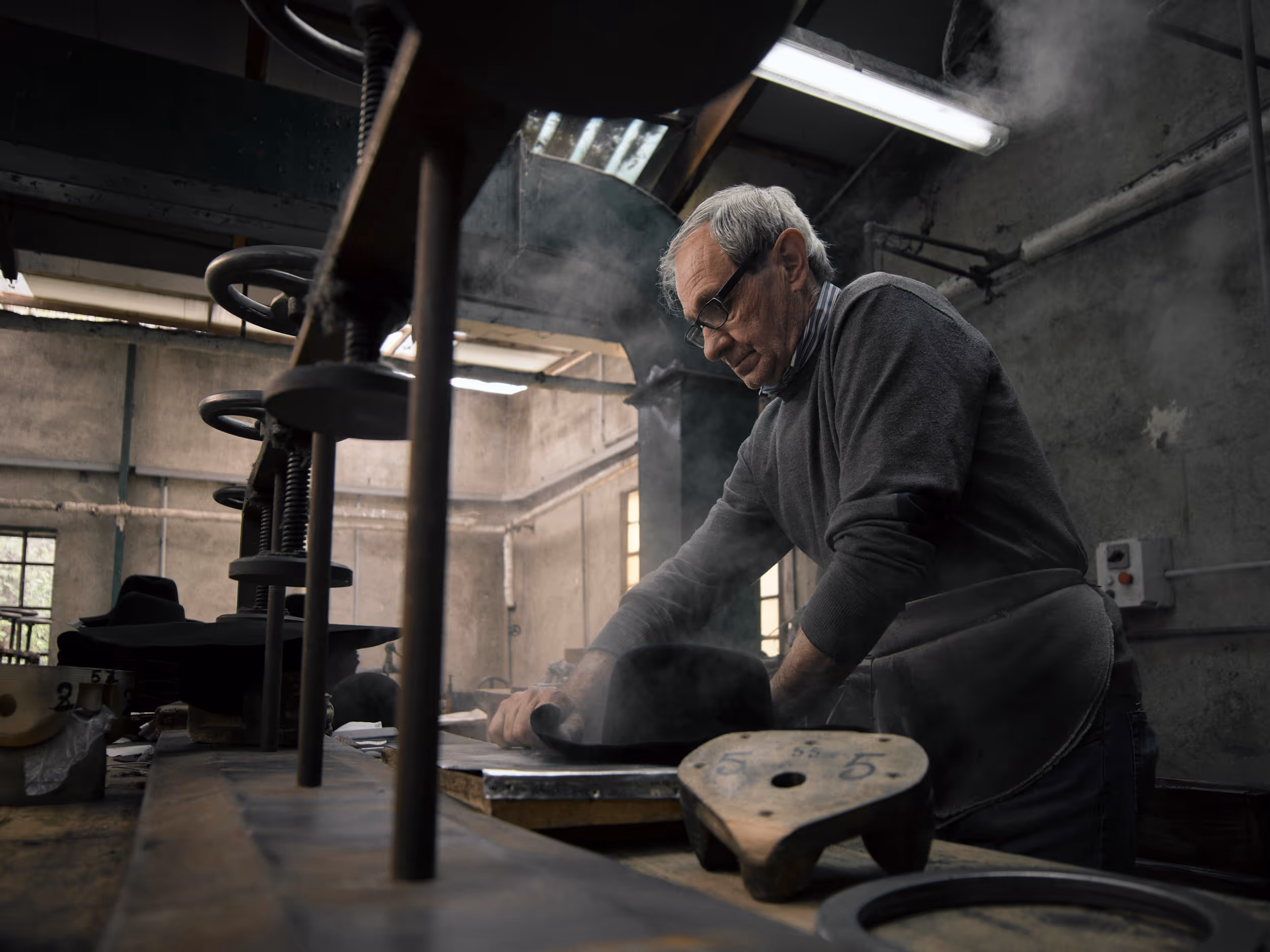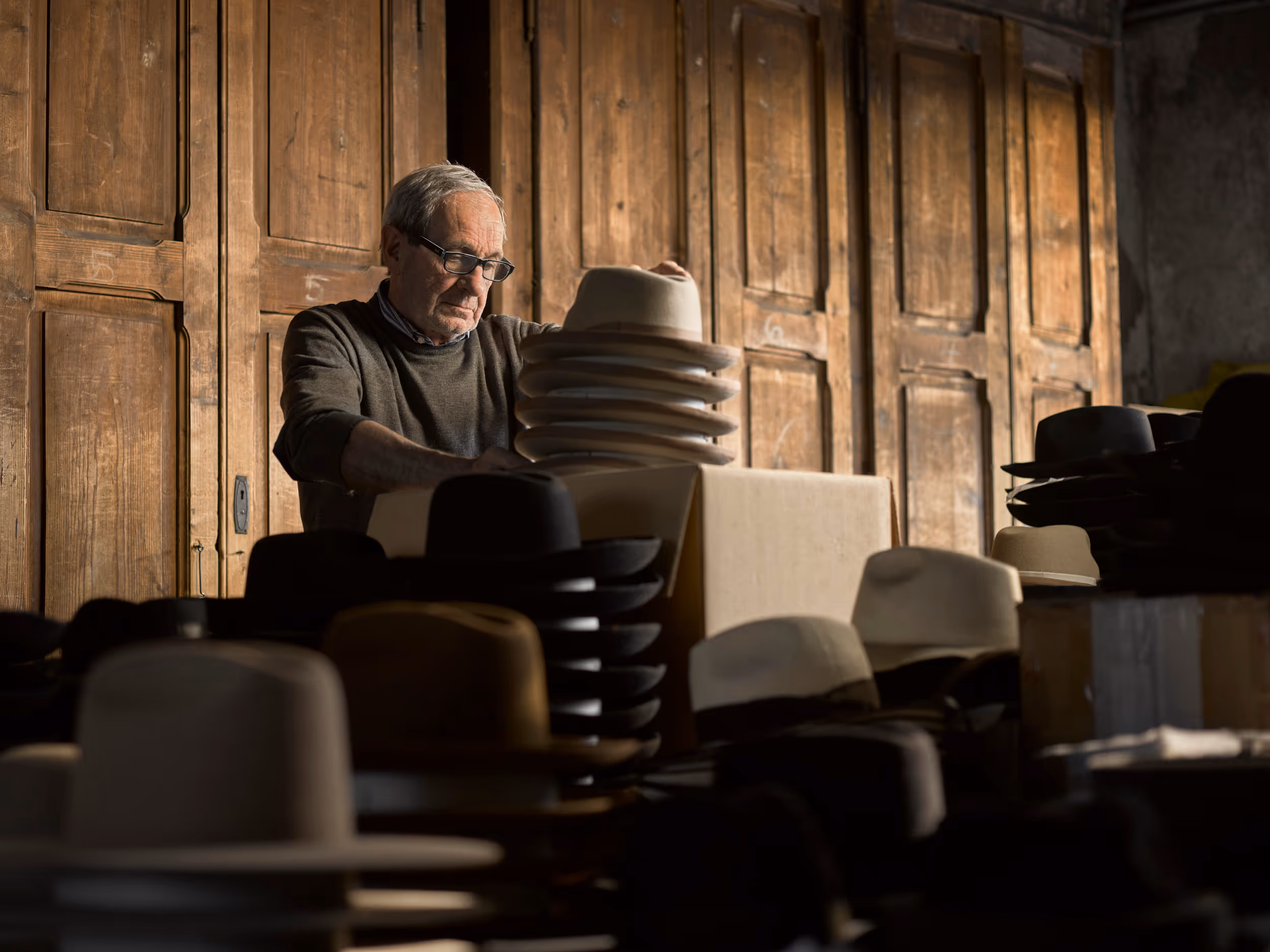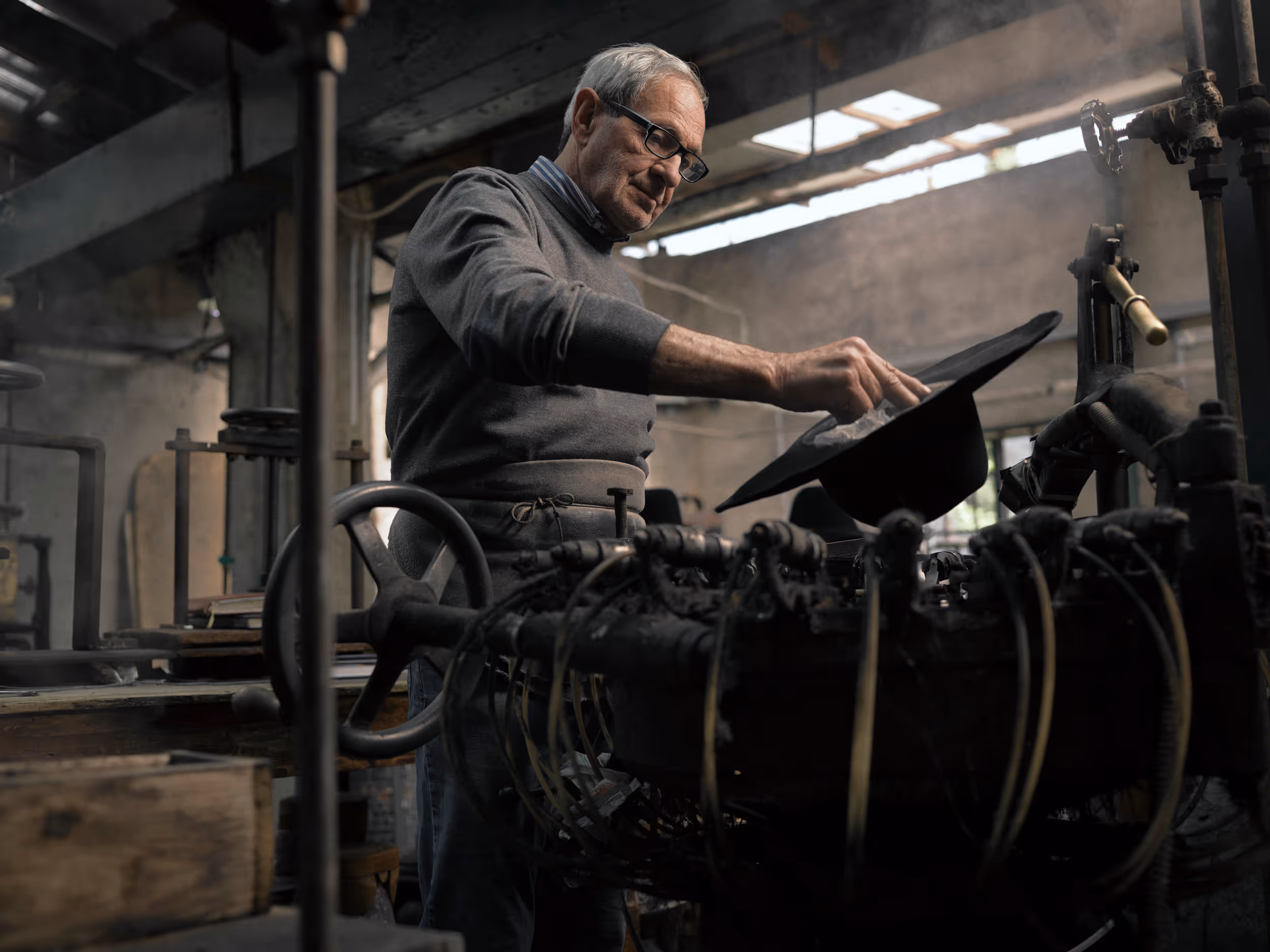 Pino Vimercati started making hats in the fall of 1953 when his dad and his brother started their factory. At that time he was just a kid, 13 years old, but fascinated by the craft. The steam that surrounded the felt, the care with which it was handled, the many piles of hats ready for shipment, and the machinery from the 19th century that they still use to this day.